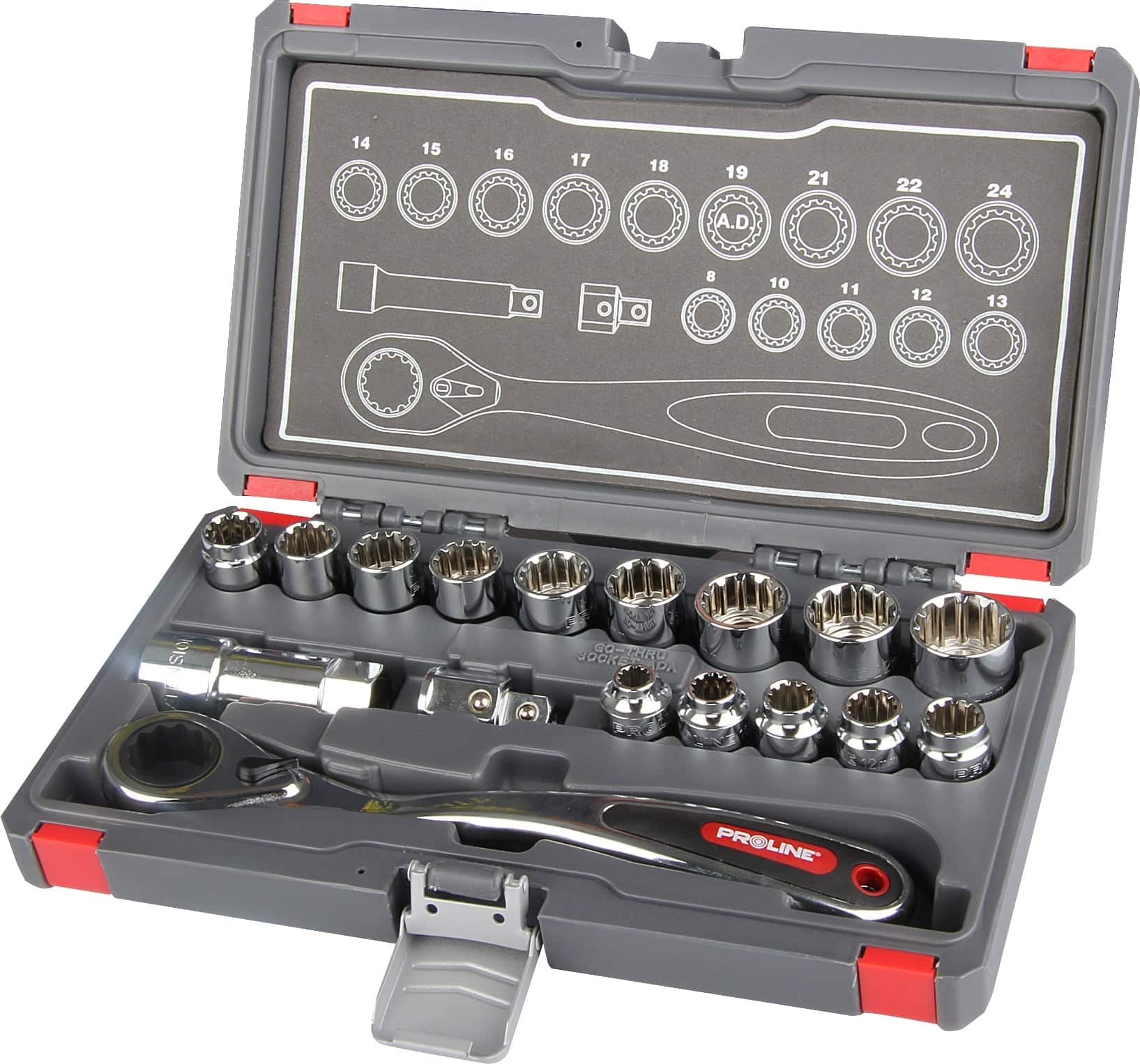 Set od 17 ključeva GO-THRU. Univerzalni dizajn ključeva za matice i vijke TORX i SPLINE. Omogućuju rad s dugim vijcima na teško dostupnim mjestima sa standardnim utičnicama.