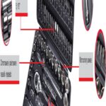 1/2 1/2 : 10, 11, 12, 13, 14, 15, 16, 17, 18, 19, 20, 21, 22, 23, 24, 27, 30, 32 mm – 1/2 “nastavak duža HEX: 14, 15, 17, 19 mm – 1/2 “nastavak duže TORX: 16, 21 mm – 1/2 čegrtaljka “72 T – 1/2 “produžna ručka: 125, 250 mm – 1/2 “bit nastavak – 1/2 “adapter u spoju socket – 1/2 nastavak5/16 ” – 1/4 nastavak TORX 4, 4,5, 5, 5,5, 6, 7, 8, 9, 10, 11, 12, 13, 14 mm – 1/4 produžni nastavak TORX 6, 7, 8, 9, 10, 11, 12, 13 mm – 1/4 PH1, 2 PZ1, 2 4, 5,5, 7 mm TORX T8, T10, T15, T20, T25, T30 HEX 3, 4, 5, 6 mm – 5/16 PH1, 2 PZ1, 2 8, 10, 12 mm TORX T40, T45, T50, T55 HEX 8, 10, 12, 14 mm – čegrtaljka 72 T – 1/4 produžna ručka socket 50, 100 mm – 1/4 produžna ručka fleksibilna 150 mm – 1/4 adapter u spoju socket – 1/4 T ključ – 1/4 ” čegrtaljka – 1/4 ” nastavak – vilicni kljuc 1,5, 2, 2,5 mm Izrađeni od CrV-a, kromiran i poliran, u vrećici s metalnim šarkama i metalnim kopčama.