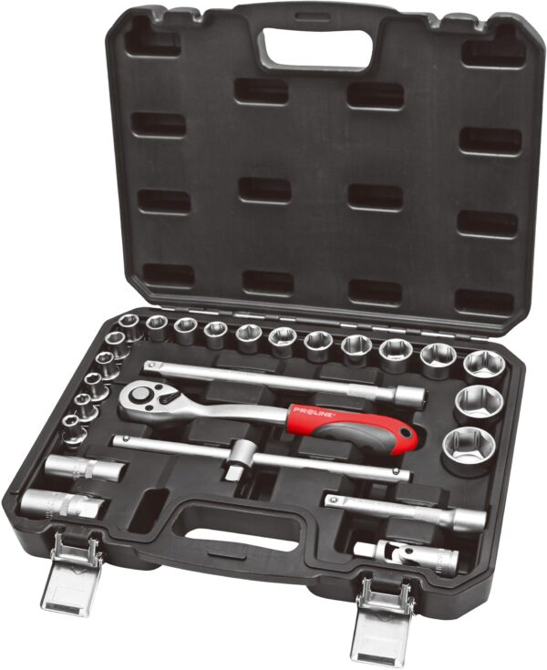Set nastavaka sa račnom 1/2″, 8-32 mm, set od 25kom. Izradžen od CrV. Prodaje se u plastičnoj kutiji s metalnim kopčama.