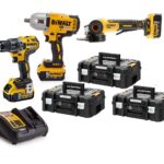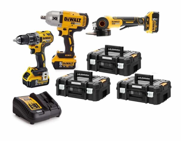 18 V / 5,0 (BL) – DCD791P2-QW Najnovija generacija moćne dvostupanjske bežične bušilice s većom snagom snage, većim momentom i većim kapacitetom bušenja, a istovremeno je kompaktnija i lakša od svojih prethodnika. Duži radni vijek baterije i dulji vijek trajanja zahvaljujući inovativnoj tehnologiji motora bez četkica. Optimalno usklađen dvostupanjski metalni mjenjač za potpuno prijenos snage. 15-stupanjski zakretni modul sa sigurnim i pouzdanim prebacivanjem izvan opterećenja osigurava precizno odvijanje u svim postavkama. Preklopna elektronika koja se lako odmjerava za precizno bušenje i precizno odvijanje. Dugotrajan rad bez problema zbog sigurnosne elektronike (stalna provjera temperature baterije, trenutna zaštita od pražnjenja i pražnjenja) Izuzetno robusna 13 mm čvrsta metalna stezaljka sa središnjim steznim čeljustima i jednostavna za rukovanje s automatskim zaključavanjem vretena. Izuzetno kompaktan i uravnotežen dizajn te ergonomsko gumirano kućište za maksimalnu sigurnost i udobnost u radu. Inovativna trostupanjska LED svjetiljka s vrlo visokom jačinom do 77 lumena za besprijekoran rad u svim svjetlosnim uvjetima. Kvalitetne 5.0 Ah Li-Ion baterije s prikazom kapaciteta baterije mogu se koristiti u svim 18-voltnim bežičnim uređajima XR. Tehnički podaci Baterija: 18 volti / 5.0 Ah Izlazna snaga: 460 W Brzina u praznom hodu: 0 – 550 / 2.000 o / min maks. Moment (h / w): 70/27 Nm maks. Kapacitet bušenja: drvo / metal 40/13 mm Opseg bušenja vretena: 1,5 – 13 mm Težina (uključujući bateriju): 1,7 kg 18V 125 mm bežična kutna brusilica – DCG406NT-XJ Inovativna tehnologija bez četkica – veći kapacitet, mršavije dimenzije, dulji vijek trajanja baterije i duži vijek trajanja. Optimizirani sustav ventilatora – učinkovito hladi kutne brusilice i elektroniku tijekom upotrebe i produžuje život. Dizajn i zaštita: Elektronička kočnica pouzdano zaustavlja disk u sekundi (2 sekunde). Elektronička spojka automatski isključuje uređaj kad je blokiran i štiti korisnike i stroj. Kombinacija elektroničke spojke i kočnice učinkovito smanjuje rizik od udara u zrak. Tehnički podaci Napon 18 V Li-ionska tehnologija baterije 5,0 Ah kapacitet baterije 800 W izlazna snaga Ulazna snaga 1000 W Brzina u praznom hodu 9000 o / min Maksimalni promjer kotača 125 mm M14 pogonsko vreteno Duljina 310 mm Težina (uključujući baterije) 1,75 kg Udarni ključ, 1/2 “, 18 V, 950 Nm – DCF899HNT-XJ Najnovija generacija XR bežičnih udarnih ključeva s većim performansama, mršavijim dimenzijama, duljim vijekom trajanja baterije i dužim vijekom trajanja zahvaljujući inovativnoj tehnologiji bez četkica. Sa max. Moment od 950 Nm najmoćniji je udarni ključ u trenutnom rasponu DeWALT-a i stoga je idealno za ekstremno teške primjene. Potpuni metalni mjenjač i mehanizam za čekić u robusnom aluminijskom kućištu. Savršeno koordinirani omjeri brzina i brzina za sve odvijače za teške uvjete rada, elektronički podesivi u tri razine. Sigurna uporaba stroja zbog elektroničke motorne kočnice. Ergonomsko gumirana središnja ručka i kompaktan, uravnotežen dizajn osiguravaju sigurno rukovanje u bilo kojem položaju. Posebno uslužan zahvaljujući svojoj modularnoj strukturi. Snažna LED žarulja s optimalno usklađenim svjetlosnim konusom. Može se koristiti sa svim 18 volti ili 54 volti Flexvolt XR baterijama u svakoj Ah klasi (nije uključeno). Kao što je standardni u T STAK-Box II i kao osnovni tip (bez baterija i punjača), idealno je prilagođen postojećim 18-voltnim XR ili 54-voltnim XR FLEXVOLT baterijama ili DEWALT “Battery Plus” sustavu. Tehnički podaci Tehnologija akumulatora: Sve 18-voltne i 54-voltne Flexvolt XR baterije u svakoj Ah klasi Brzina u praznom hodu: 0 – 400/1200 / 1.900 o / min Brzina u praznom hodu: 0 – 600 / 1.800 / 2.400 min-1 Maksimalni obrtni moment: 135/400/950 Nm Maksimalni zakretni moment otpuštanja: 1.625 Nm Držač alata: vanjski kvadrat 1/2 “sa prstenom HOG Težina (koristeći 5,0 Ah bateriju u kg): 3,3 kg Opseg isporuke Bušilica DCD791P2-QW DCG406NT-XJ bežična kutna brusilica Imp. DCF899HNT-XJ 3 on 5Ah 18V XR Li ionska baterija 3 x T STACK kutija