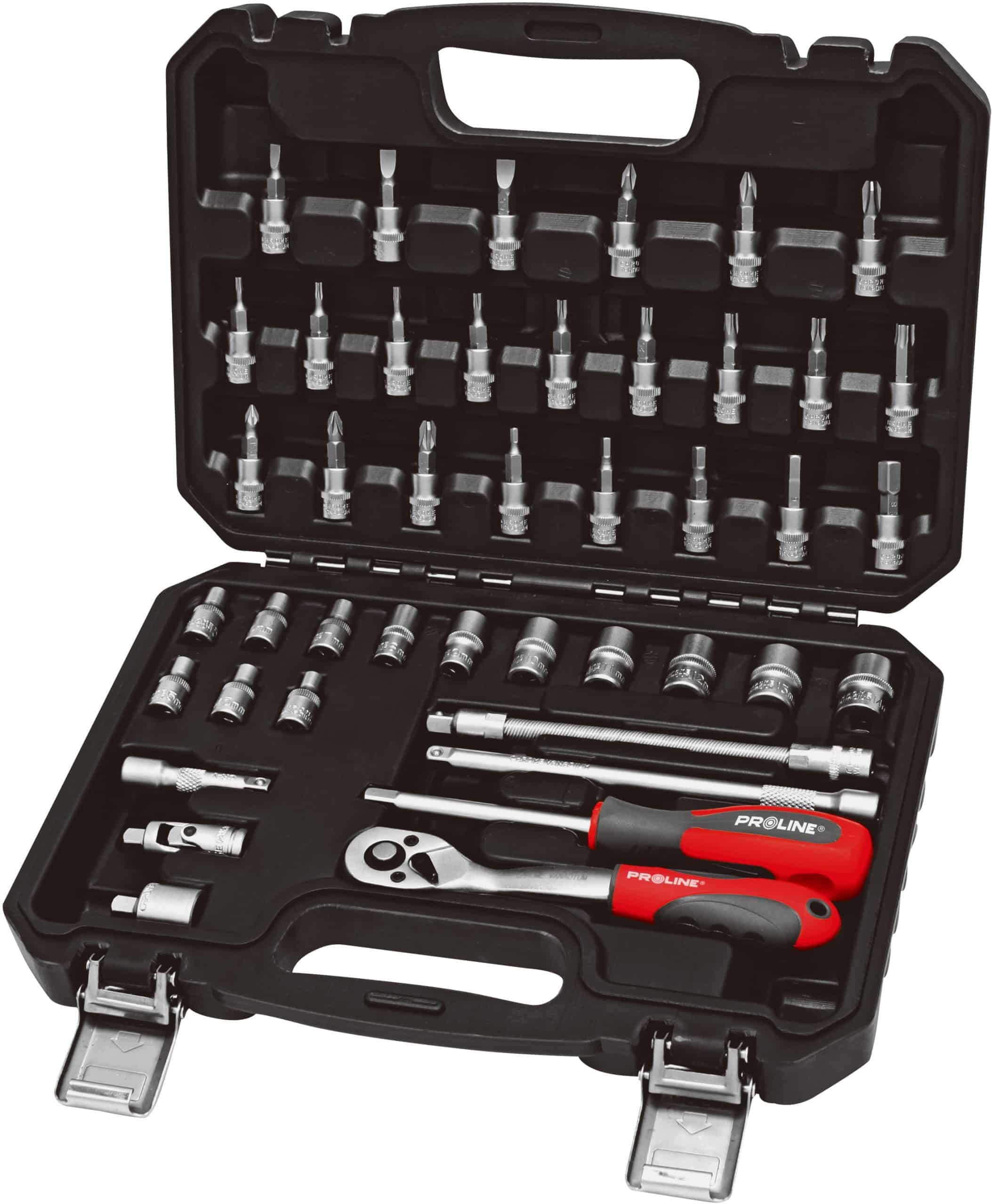 Set nasadnih ključeva 1/4 , 4-14 mm, set 43 kom. Izrađen od CrV Prodaje se u plastičnoj futroli s metalnim kopčama. – utični šesterokutni: 1/4 4, 4,5, 5, 5,5, 6, 7, 8, 9, 10, 11, 12, 13, 14 mm – čegrtaljka: 1/4 72 T – produžetak za utične ključeve: 1/4 50, 150 mm – karadanski zglob: 1/4 – držač za nastavke: 1/4 – adapter: 3/8 1/4 – Fleksibilni produžetak: 1/4 145 mm – nastavci vijaka: 1/4 PH 1, 2, 3 PZ 1, 2, 3 4, 5,5, 6,5 mm TORX T8, T9, T10, T15, T20, T25, T27, T30, T40 HEX 3, 4, 5 , 6, 8 mm