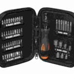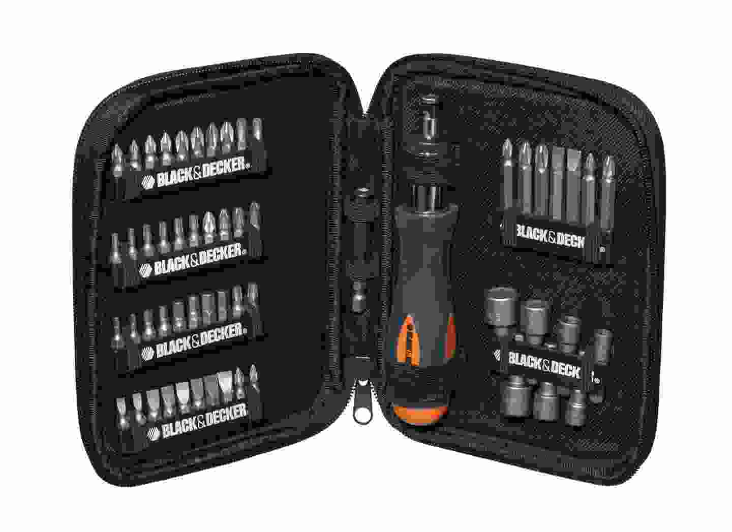 56-dijelni set s račnom Black+Decker A7104 sadrži širok izbor 25 i 50 mm bit nastavaka, nasadne ključeve, magnetni držač za nastavke i račnu. 25 mm odvijači: – Phillips: 4×1 / 4×2 / 2×3 – Pozidriv: 2×1 / 2×2 / 2×3 – Slotted: 2×4 / 4×6 / 2×7,2 – Torx: 10 / 15 / 20 / 2×25 – Hex: 3 / 4 / 5 / 2×6 50 mm odvijači: – Phillips: 1 / 2 / 3 – Pozidriv: 1 / 2 – Slotted: 6 / 7,2 Nasadni ključevi: 5 / 6 / 7 / 8 / 9 / 10 / 11 / 12