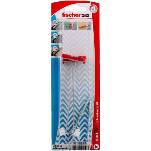 Der Nylon-Kippdübel fischer DuoTec für hohe Zug- und Querlasten durch 2 Komponenten. Einfache Montage mit geringem Bohrlochdurchmesser von 10 mm und kurzem Kippelement auch in engen und gedämmten Hohlräumen. Einfache Vormontage, der Dübel fällt auch ohne Schraube nicht in das Bohrloch. Kein Einschneiden und damit Schwächung der Gipskartonplatte. Das Kippelement klappt hinter der Platte automatisch auf und gibt ihm seine Tragkraft. Durch die flexible Schraubenaufnahme aus rostfreiem Stahl kann der Kippdübel mit Holz- und Spanplattenschrauben oder metrischen Haken- und Gewindestangen mit Kontermutter verwendet werden. Bei Bohrlochtreffern in Vollbaustoffen funktioniert er wie ein Spreizdübel.
