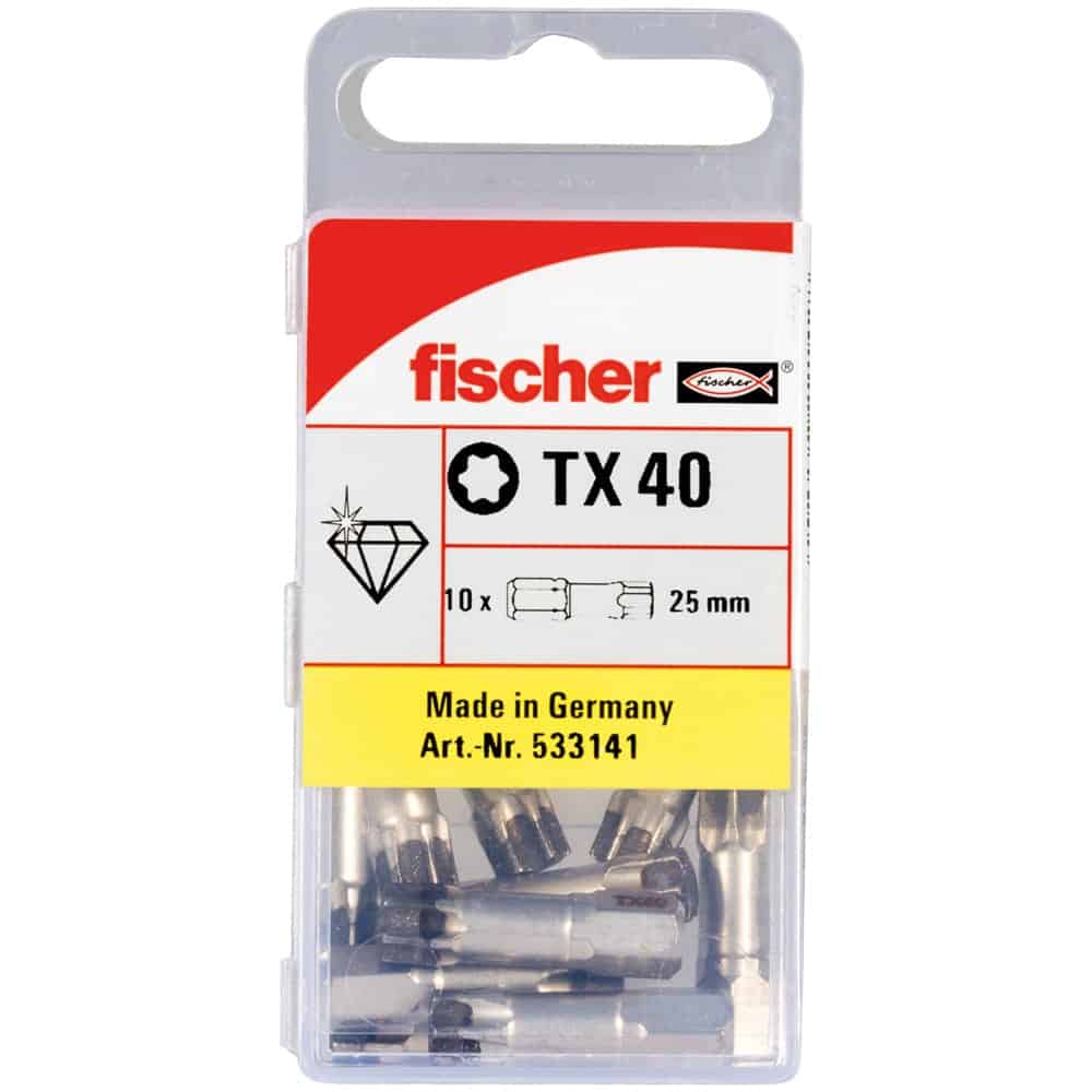 Der fischer DiamantBit FDB T ist ein extrem robuster und anwendungsfreundlicher Bit mit TX-Antrieb. Der Bit wird aus hochwertigem Chrom-Vanadium-Stahl hergestellt. Die spezielle Wärmebehandlung macht den Bit sehr widerstandsfähig. Die Nickelbeschichtung des gesamten Bits schützt zudem sehr lange gegen Korrosion.