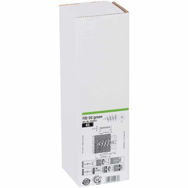 Das Granulat zur Herstellung des fischer Dämmstoffdübels FID Green wird mindestens zur Hälfte aus nachwachsenden Rohstoffen gewonnen. Diese stehen nicht in Konkurrenz zu Anbauflächen für Nahrungs- und Futtermittel. Der FID Green verfügt über die gleichen Leistungsmerkmale und Tragfähigkeit wie das Original. Mit dem FID werden leichte Anbauteile in verputzten und unverputzten Dämmstoffplatten aus Polystyrol und aus Polyurethan zu befestigen. Dazu wird der fischer FID Green mit der Hand oder einem Akku-Schrauber gesetzt. Die spezielle Gewindespirale schneidet sich dabei formschlüssig in die Dämmplatte. Die Anbauteile wie Briefkästen, Lampen oder Bewegungsmelder können mit einer 4 bis 4,5 mm Schraube befestigt werden.