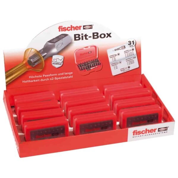 Das fischer FPB Bit Set Profi W 31 Display ist mit 10 Sets zu je 31 Teilen bestückt: 2x PZ1, 4x PZ2, 2x PZ3, 2x PH1, 4x PH2, 2x PH3, 1x TX8, 2x TX10, 1x TX15, 2x TX20, 2x TX25, 1x TX27, 1x TX30, 1x TX40 und je 1x Schlitz 4,5 sowie 5,5 und 6,0. Zusätzlich enthält das Set einen Universalbithalter. Oft verwendete Bits sind mehrfach vorhanden. Das hochwertige Bitset ist ideal für alle Schraubarbeiten in Werkstatt und Baustelle.