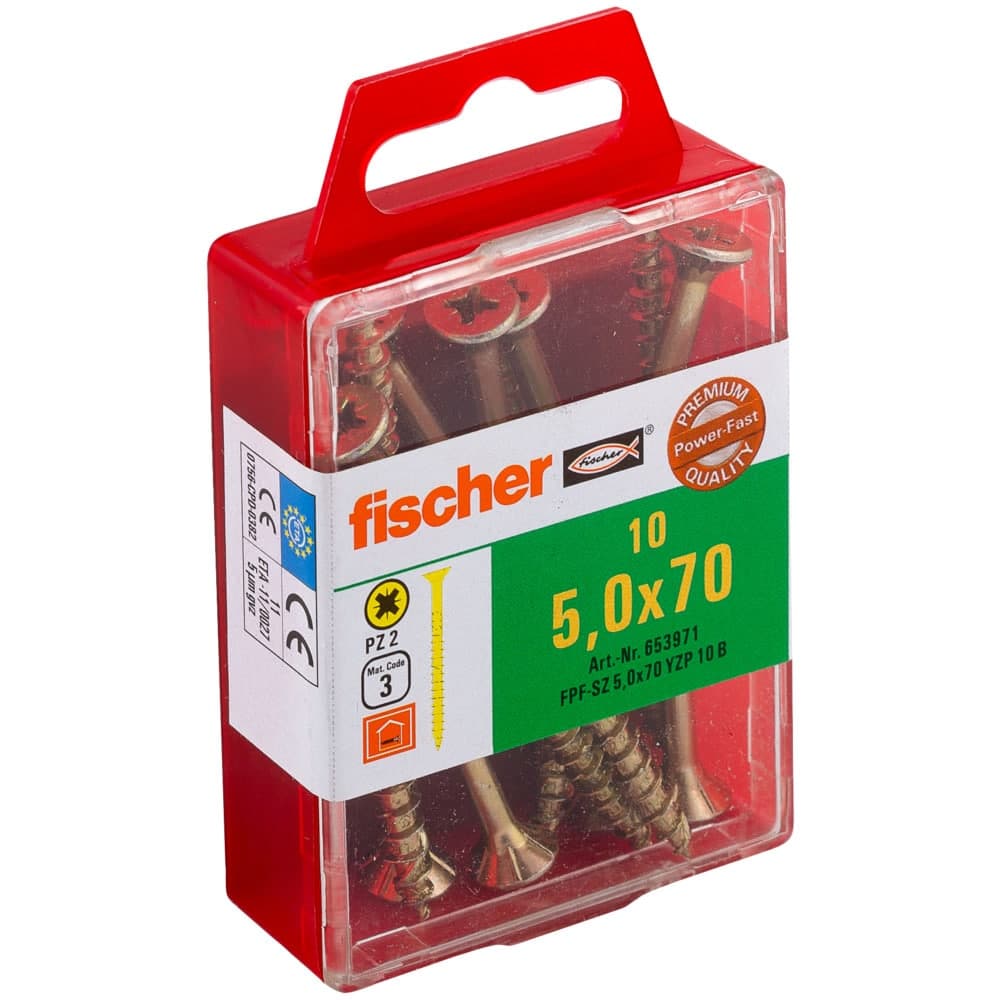 Die fischer Power-Fast FPF-ST YZP ist eine galvanisch verzinkte, gelb passivierte Schraube mit Teilgewinde und Kreuzschlitz-Aufnahme. Der Senkkopf ermöglicht die oberflächenbündige Montage im Holz. Die Ausführung mit Teilgewinde ermöglicht das feste Aneinanderziehen von Holzelementen. Die Schraube eignet sich für Befestigungen von tragenden Bauteilen in beschichtetem Holz, Hartholz, Weichholz und Holzverbindungen.