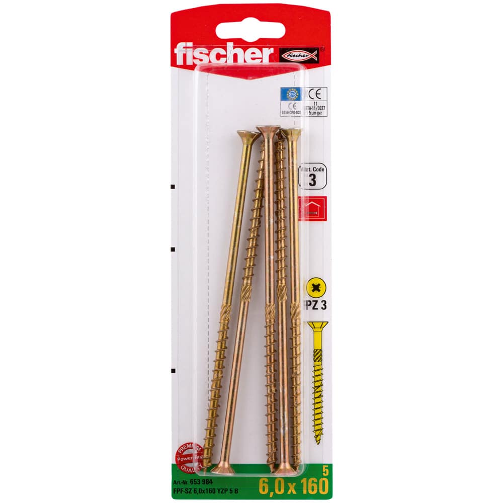Die fischer Power-Fast FPF-ST YZP ist eine galvanisch verzinkte, gelb passivierte Schraube mit Teilgewinde und Kreuzschlitz-Aufnahme. Der Senkkopf ermöglicht die oberflächenbündige Montage im Holz. Die Ausführung mit Teilgewinde ermöglicht das feste Aneinanderziehen von Holzelementen. Die Schraube eignet sich für Befestigungen von tragenden Bauteilen in beschichtetem Holz, Hartholz, Weichholz und Holzverbindungen.