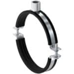 Die fischer Massivrohrschelle FRSM 5″ für Nenngröße 5″ mit Schalldämmeinlage zum Befestigen von mittleren bis schweren Rohrleitungen mit Gewindestangen oder Stockschrauben. Die Zweischraubigkeit ermöglicht die optimierte Anpassung auf den Rohraußendurchmesser. Anschlussmutter mit Zoll-Gewinde für eine Rohrbefestigung mit höherer Biegefestigkeit. Rohrschellenschrauben mit Verlustsicherung.