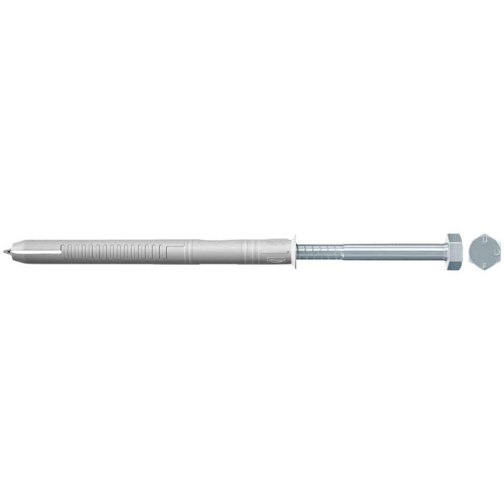 Der fischer Langschaftdübel FUR-SS besteht aus einer Dübelhülse aus hochwertigem Nylon und einer Sechskantschraube aus galvanisch verzinktem Stahl. Der FUR-SS wird in der zeitsparenden Durchsteckmontage gesetzt. Beim Eindrehen der Schraube verspreizen im Vollbaustoff die Lamellen gleichmäßig gegen die Bohrlochwand. In Lochbaustoffen spreizen die Lamellen am Steinsteg und bilden im Hohlraum einen Hinterschnitt. Damit ist der fischer Langschaftdübel FUR geeignet, um Kanthölzer, Tore und Türen in allen Baustoffen sicher zu befestigen.