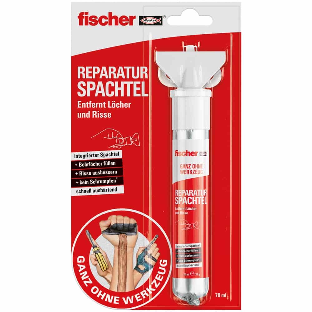 Hässliches Bohrloch in der Wand? Risse oder ausgestoßene Ecken? Kein Problem. Mit dem fischer REPARATURSPACHTEL ist das in wenigen Sekunden repariert. Sie besteht aus einer Acryl-Gips-Spachtelmasse die durch ihre elastische Eigenschaft sich flexibel Löchern und Rissen anpasst und diese füllt. Die Spachtelmasse von fischer ist vielseitig für verschiedene Untergründe geeignet und härtet schnell aus. Der Spachtel ist dabei schon in den Schlauchbeutel integriert. Mit diesem Reparaturset verschwinden unschöne Löcher und Risse in Ihrer Wand.