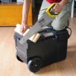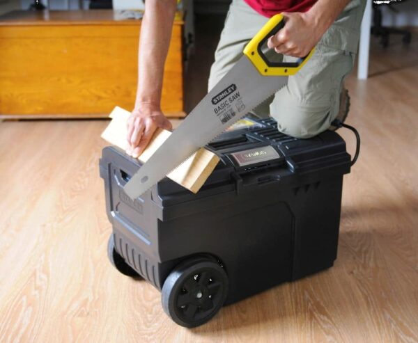 – organizator u poklopcu za manje dijelove i pribor – duboki pladanj sa prenosnim vertikalnim spremnikom za pohranu i prenošenje električnog i ručnog alata – metalna ručka na izvlačenje za lako manevriranje – trajni kotači veličine 17,78cm/ 7 – ručka od dva materijala na gornjem poklopcu – centralna brava se otvara jednim samim dodirom – omogučava brz i lak pristup – veliki kapacitet 57 litara /~13 Gal. – V-utor na poklopcu za rezanje materijala – 62 x 38 x 42 cm
