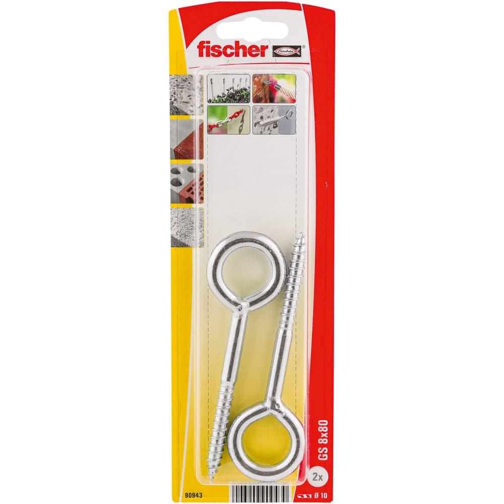 Die fischer Ösenschraube GS 8 ist aus galvanisch verzinktem Stahl hergestellt. Die maximale Tragfähigkeit erreicht die Universal-Ösenschraube mit den empfohlenen fischer Spezialdübeln. Der fischer Dübel S 12 R ist zusammen mit der Ösenschraube für die Verankerung in Vollbaustoffen wie Beton, Kalksand-Vollstein oder Vollziegel geeignet. Der fischer Dübel S 14 HR ist in Kombination mit der Ösenschraube für alle Lochbaustoffe zu empfehlen. Die fischer Ösenschraube GS ist ideal, um Seile, Ketten oder Wäscheleinen zu befestigen.