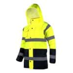 MATERIAL: Premaz: 100% poliester Oxford 300D, 180 g/m2 PUcoated. Podloga: 100% poliester, 160 g/m2. Podloga: 190T poliester, taft 54 g/m2. Najvišja stopnja vidljivosti: ocena 3. Odsevne trakove po EN ISO 20471. Vodotesni šivi. Sponki, prevlečeni s plastiko, ki ščiti pred vodo. Vodoodporna nastavljiva kapuca, skrita v ovratnik. Notranje fleksibilne manšete za zaščito pred vetrom in mrazom. Nastavitev širine na spodnjem delu jakne z dvostransko vrvico z omejevalnikom. Zadrga z dodatnim zavihkom z zadrgo. 7 žepov (4 zunanji, vključno z enim za mobilnik in 3 notranjimi). Prezračevalne odprtine za izboljšanje kroženja zraka. NORMA: EN ISO 13688, EN ISO 20471