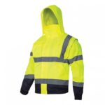 Materijal: 100% poliester Oxford 300D 180 g/m2 s poliuretanskim (PU) premazom. Izolacija 100% poliester 160 g/m2. Podloga: 190T poliester taft 54 g/m2. Reflektirajuće trake u skladu s EN ISO 20471. Vodonepropusni šavovi. Vodootporna, podesiva kapuljača, skrivena u čičak ovratniku. Manšete su na rubu završene čičak trakom. Podesite donju širinu jakne s rubom. Zatvarač s dodatnim preklopom koji se zatvara iglama. Rukavi koji se mogu skinuti. 5 džepova, 1 sa patentnim zatvaračem (4 vanjska i 1 unutarnji). STANDARD: EN ISO 13688, EN ISO 20471.