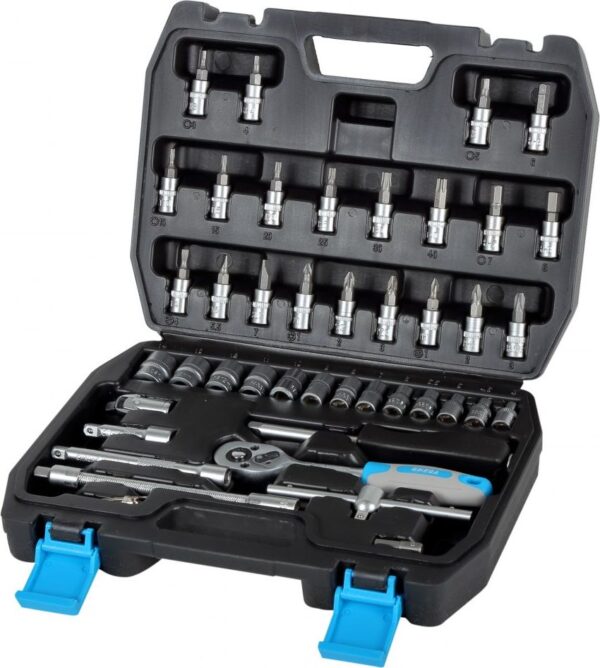 1/4-inčni set utičnica i utičnica, Mega 58046. Tipke su izrađene od CrV čelika. Čvrsto plastično kućište. Set sadrži 46 elemenata: 1/2 “uskočna ručka 72 T 1/4” uskočna ručka 72 T 1/4 “odvijač 1/4” šesterokutna utičnica 4 mm, 4,5 mm, 5 mm, 5,5 mm, 6 mm, 7 mm, 8 mm, 9 mm , 10 mm, 11 mm, 12 mm, 13 mm, 14 mm 1/4 “nastavci 50 mm, 100 mm 1/4” fleksibilni nastavak 125 mm 1/4 “priključak klizne ručke 1/4″ univerzalni priključak 1/2″ – 1/4″ redukcija na utičnicama imbus ključevi 1,5 mm, 2 mm, 2,5 mm 1/4” utičnice: HEX: 3, 4, 5, 6, 7, 8 mm; PZ 1, 2, 3; PH 1, 2 , 3; TORX T10, T15, T20, T25, T30, T40; SL4, SL5, SL5.5, SL7; SQ1, SQ2, SQ3.