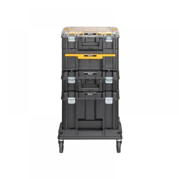 DEWALT TSTAK Tower je opremljen z razli?nimi ohišji na nosilni podlagi. Opis: V kompletu: 1 x organizator za prozorne pokrove TSTAK V, ki ima 2 velika in 5 majhnih odstranljivih kov?kov. Prihaja z: 1 x TSTAK V Clear Lid Organizator, ki ima 2 veliki in 5 majhnih odstranljivih skodelic za shranjevanje majhnih delov in dodatkov. Njegova edinstvena zasnova pokrova za velike obremenitve zaklene vse prostore za varno shranjevanje. 1 x TSTAK Toolbox II (kov?ek z ravnim vrhom) trpe?en, trpe?en kov?ek za orodje iz 3 mm polipropilenske plastike. Zaradi trdnih kovinskih te?ajev in te?kih kovinskih zapahov je izjemno robusten, ro?aji iz dveh materialov pa izboljšajo udobje uporabnika. 1 x TSTAK Toolbox III (globok predal), trpe?en kov?ek za orodje iz 3 mm polipropilenske plastike. Ima trden drsni predal s krogli?nimi le?aji in ima 8 odstranljivih posod za shranjevanje s pokrovi za odli?no organizacijo. Njegov dvodelni ro?aj zagotavlja udobje uporabnika. 1 x TSTAK VI Deep Toolbox velika enota za shranjevanje ve?jih ro?nih orodij in elektri?nega orodja. Na voljo je s snemljivim pladnjem za hiter dostop do majhnih orodij in dodatkov ter ima vgrajen širok ro?aj za enostavno in stabilno prenosljivost. 1 x nosilca TSTAK lahko hitro in enostavno namestite na podstavek katere koli enote TSTAK, da omogo?ite la?ji prevoz orodij in dodatkov. Z vrtljivimi kolesi za 360 in blokirno zavoro za najve?jo okretnost. Kompaktna in lahka oblika za enostavno shranjevanje, kadar ni v uporabi.