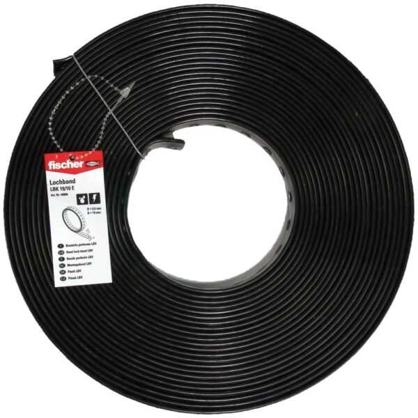 Das fischer Lochband LBK mit eingestanzten Löchern zur einfachen Montage in kunststoffummantelter Ausführung. Die Blechstärken der Lochbänder erlauben ein einfaches Ablängen mittels Blechschere. Die Lochgeometrie der Lochbänder ermöglicht die Bodenbefestigung mit dem fischer Einschlagnagel ED.