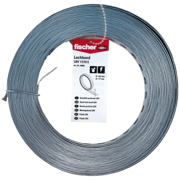 Das fischer Lochband LBV mit eingestanzten Löchern zur einfachen Montage in verzinkter Ausführung. Die Blechstärken der Lochbänder erlauben ein einfaches Ablängen mittels Blechschere. Die Lochgeometrie der Lochbänder ermöglicht die Bodenbefestigung mit dem fischer Einschlagnagel ED.