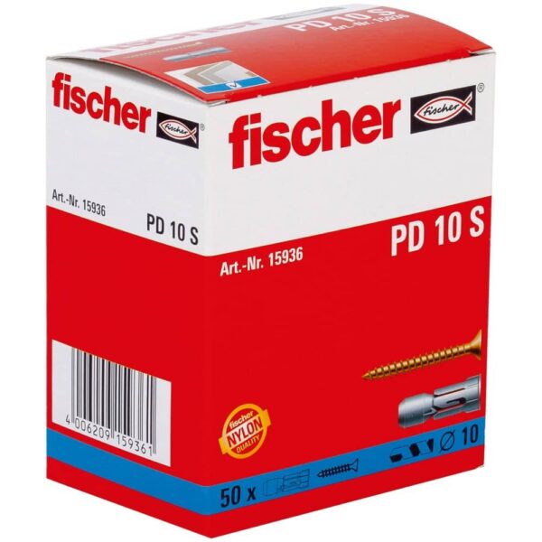 Der fischer Plattendübel PD ist ein Spreizdübel für Befestigungen in Gipskarton-, Gipsfaser- und Holzbaustoffplatten. Der Dübel aus hochwertigem Nylon wird in der Vorsteckmontage gesetzt. Beim Anziehen der Spanplattenschraube wird der Konus in die Hülse gezogen und der Dübel spreizt im Baustoff auf. Dadurch kann der PD auch bei einer geringen Hohlraumtiefe sicher gesetzt werden. Der fischer Plattendübel PD ist ideal, um Handtuchhalter, Gardinenschienen und leichte Spiegelschränke zu befestigen.