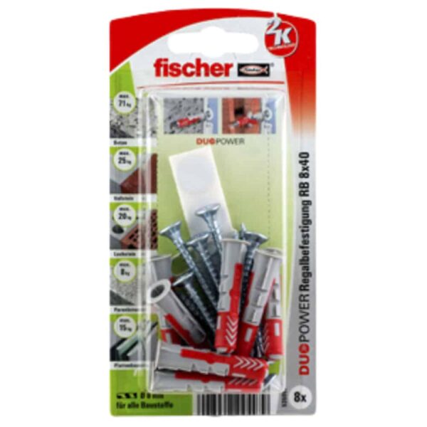 Der fischer DuoPower bietet sehr gute Haltewerte durch 2 Komponenten: Die graue Komponente aus hochwertigem Nylon aktiviert je nach Baustoff automatisch das optimale Funktionsprinzip (Spreizen, Klappen, Knoten) für besten Halt. Die Expansionsflügel der roten Komponente unterstützen die sichere Verspreizung und bieten zusätzliche Sicherheit zur grauen Komponente. Einfaches Eindrehen der Schraube und richtiges „Ziehen“ zum Schluss. Kein Überdrehen der Schraube. Der am Dübelkopf angeformten Rand verhindert, dass der Dübel ins Bohrloch rutscht.