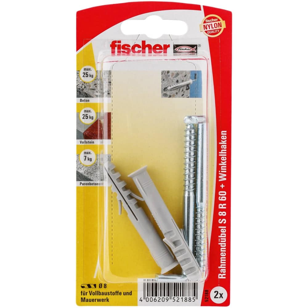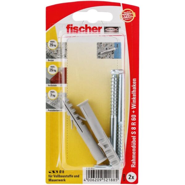 Der fischer Rahmendübel S 8 RW wird aus hochwertigem Nylon hergestellt. Dadurch ist der Dübel besonders robust bei der Montage und garantiert dauerhafte Sicherheit. Der Rahmendübel S 8 ist geeignet für die Befestigung in Vollmaterialien und ist durch seine Länge geeignet um Putzschichten bis max. 1cm Dicke zu überbrücken. Der mitgelieferte Winkelhaken ist speziell auf den Dübel angepasst und garantiert somit hohe Haltewerte.