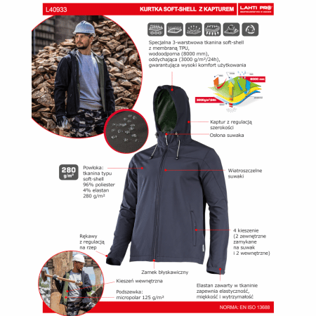 Opis: MATERIJAL: 96% poliester, 4% elastan, 280 g / m Podstava: mikro polarno runo 125 g / m. Posebna, troslojna mekana omotnica s TPU membranom, vodonepropusna (8000 mm), zrak (3000 g / m / 24 h) za vrhunsku udobnost. Elastan u tkanini čini je fleksibilnom, mekom i izdržljivom. 4 džepa (2 vanjska, s patentnim zatvaračem i 2 unutarnja). Napa s podesivom širinom. Vjetrootporni patentni zatvarači. Štitnik za bradu STANDARD: EN ISO 13688