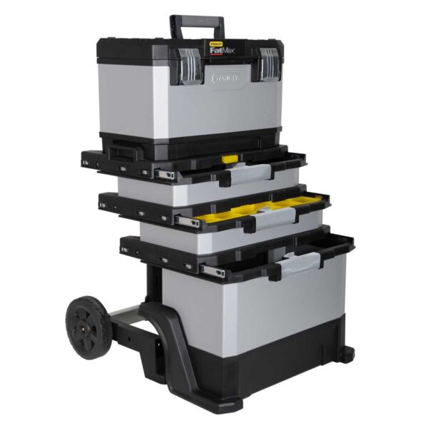 STANLEY FATMAX METALNA/PLASTIČNA MOBILNA RADIONICA. 20 Odvojiva metalna/plastična kutija za alat sa prenosivom ladicom. Velike metalne nehrdžajuće brave sa lokotom. 2 duboke ladice od 10,15 cm/4 sa klizećim ležajevima. Velika metalna kutija za pohranu daje izuzetno veliki kapacitet za pohranu alata koji se treba prenositi Izdržljivi 7 kotači. Sistem konzole za trenutni pristup pohranjenom alatu
