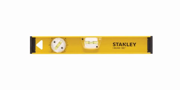 Stanley libela PRO 180 400 mm – Dugotrajno aluminijsko tijelo “I” profila za čvrstoću i dugotrajnost – 3 cjevaste fiole: 1 vodoravna fiola na vrhu, 1 okomita i 1 kutna, za 180 stupnjeva okretna fiola (dvostruka ljestvica; od 0 stupnja do 90 stupnja i 10 stupnjeva diferenca) – Bočne ublaživači za libelu, ukoliko vam padne – Točnost: +/- 1,5 mm/m