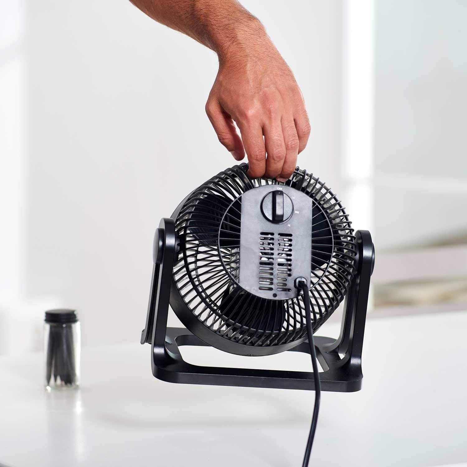 Prijenosni ventilator: mali, prijenosni i kompaktni ventilator, idealan za radni stol; ukupne je veličine 15x24x23,5 cm i nosača. 3 brzine: ima 3 brzine, s maksimalnim protokom zraka od 231,2 m3 / h. 3 lopatice: 3 snažne lopatice koje pružaju maksimalan protok zraka, ventilator velike snage, do 35 W. Podesivi nagib: sustav nagiba koji pruža širok kut protoka zraka i maksimalnu fleksibilnost; možete usmjeravati zrak u smjeru koji vam se najviše sviđa. Protuklizna površina: klizna površina za bolju stabilnost.