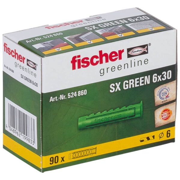 Der fischer Spreizdübel SX Green wird zu mindestens 50 % aus nachwachsenden Rohstoffen hergestellt. Durch die Vierfach-Spreizung leitet der Nylondübel die Kraft optimal in den Baustoff ein. Die Verdrehsicherung arretiert den SX Green fest im Bohrloch. Der am Dübelkopf angeformten Rand verhindert, dass der Dübel ins Bohrloch rutscht.