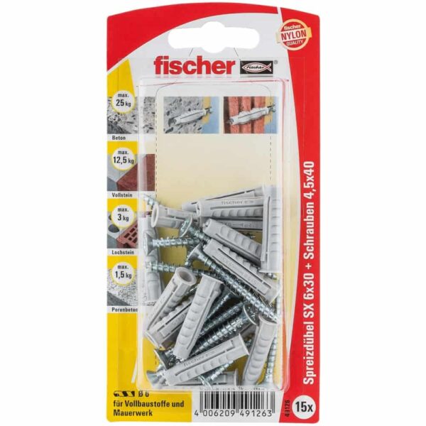Der fischer Spreizdübel SX leitet durch die Vierfach-Spreizung die Kraft optimal in den Baustoff ein. Neben der typischen Spreizung garantiert das für die Herstellung verwendete hochwertige Nylon die sichere und dauerhafte Befestigung. Der am Dübelkopf angeformte Rand verhindert, dass der Dübel ins Bohrloch rutscht. Die mitgelieferten Schrauben sind optimal auf den fischer Spreizdübel SX abgestimmt. Dies garantiert perfekten Halt.