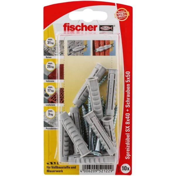 Der fischer Spreizdübel SX leitet durch die Vierfach-Spreizung die Kraft optimal in den Baustoff ein. Neben der typischen Spreizung garantiert das für die Herstellung verwendete hochwertige Nylon die sichere und dauerhafte Befestigung. Der am Dübelkopf angeformte Rand verhindert, dass der Dübel ins Bohrloch rutscht. Die mitgelieferten Schrauben sind optimal auf den fischer Spreizdübel SX abgestimmt. Dies garantiert perfekten Halt.
