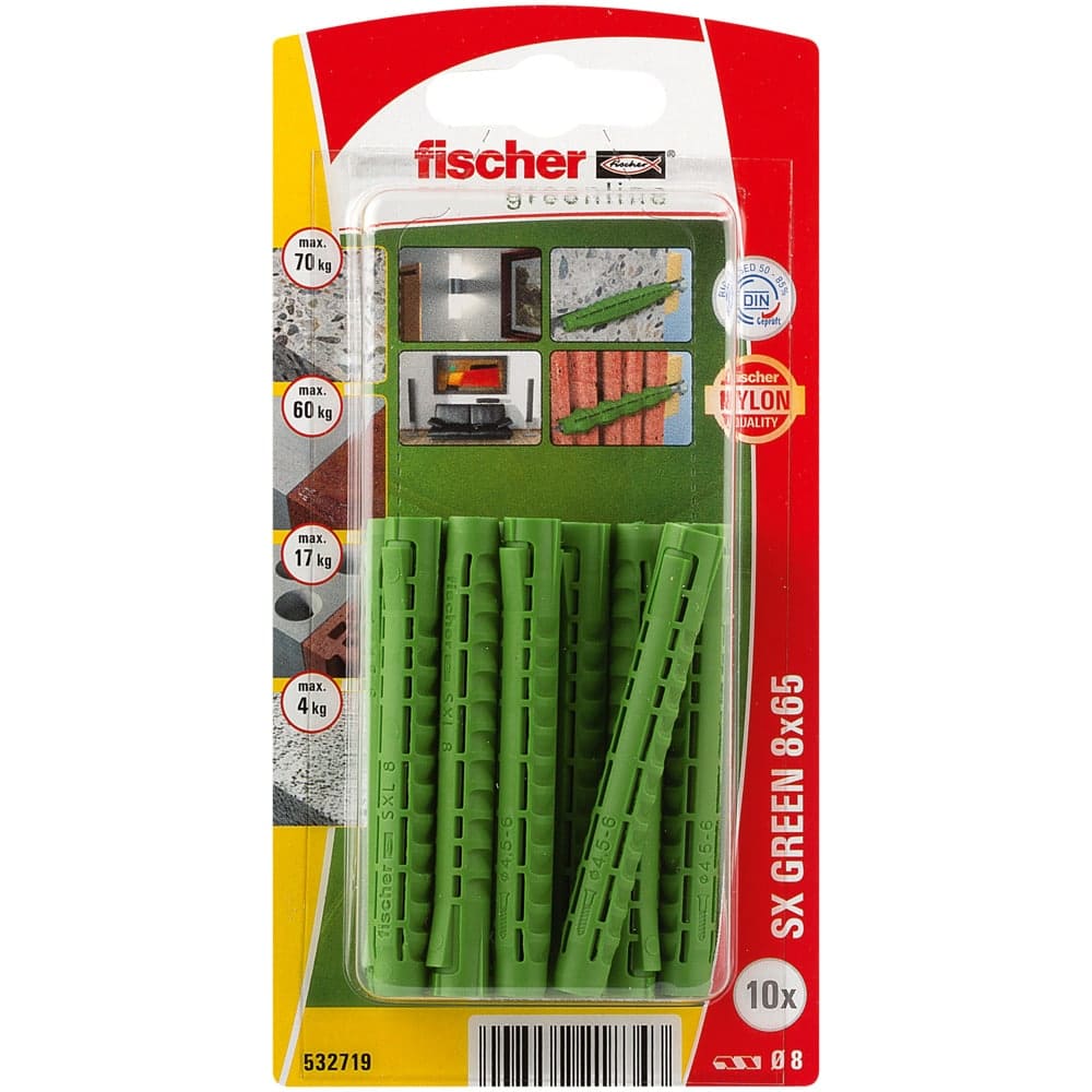 Der fischer Spreizdübel SX Green wird zu mindestens 50 % aus nachwachsenden Rohstoffen hergestellt. Durch die Vierfach-Spreizung leitet der Nylondübel die Kraft optimal in den Baustoff ein. Die Verdrehsicherung arretiert den SX Green fest im Bohrloch. Ideal für Befestigungen in Lochbaustoffen, in Porenbeton und zur Putzüberdeckung ist diese Variante mit größerer Verankerungstiefe.
