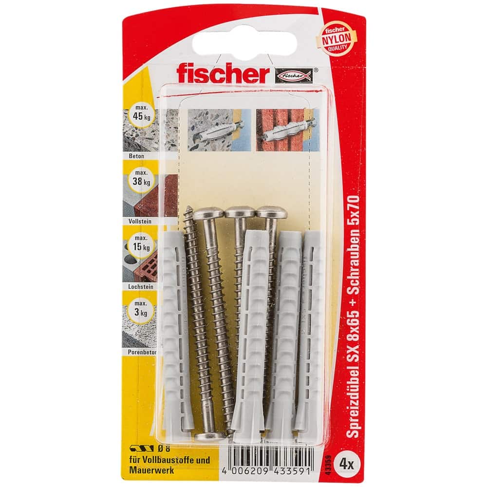 Der fischer Spreizdübel SX leitet durch die Vierfach-Spreizung die Kraft optimal in den Baustoff ein. Neben der typischen Spreizung garantiert das für die Herstellung verwendete hochwertige Nylon die sichere und dauerhafte Befestigung. Der am Dübelkopf angeformte Rand verhindert, dass der Dübel ins Bohrloch rutscht. Die mitgelieferten Schrauben A2 sind optimal auf den fischer Spreizdübel SX abgestimmt. Dies garantiert perfekten Halt beispielsweise von Leuchten, Leisten, Bad- und WC-Einrichtungen sowie leichten Wandschränken.
