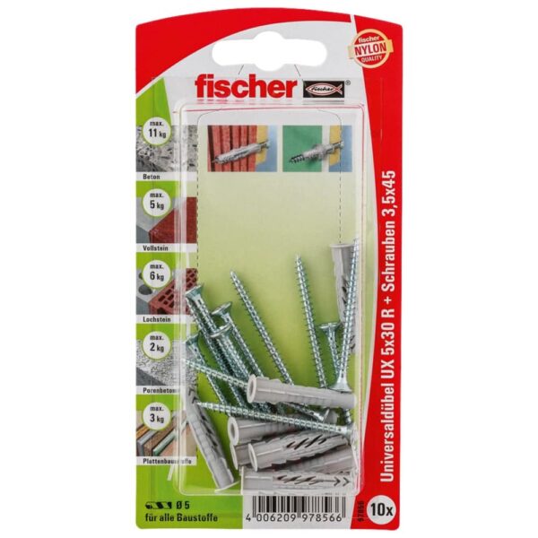 Der fischer Universaldübel UX ist ein Kunststoffdübel aus hochwertigem Nylon. Der fischer Universaldübel verspreizt in Vollbaustoffen und verknotet in Hohl- und Plattenbaustoffen für maximalen Halt. Damit ist der fischer UX immer die richtige Wahl – auch bei einem unbekannten Baustoff. Der Rand verhindert ein Tieferrutschen bei der Montage. In der Version mit Rand ist der fischer Universaldübel UX für die Vorsteckmontage geeignet. Die mitgelieferten Schrauben sorgen für optimalen Halt.
