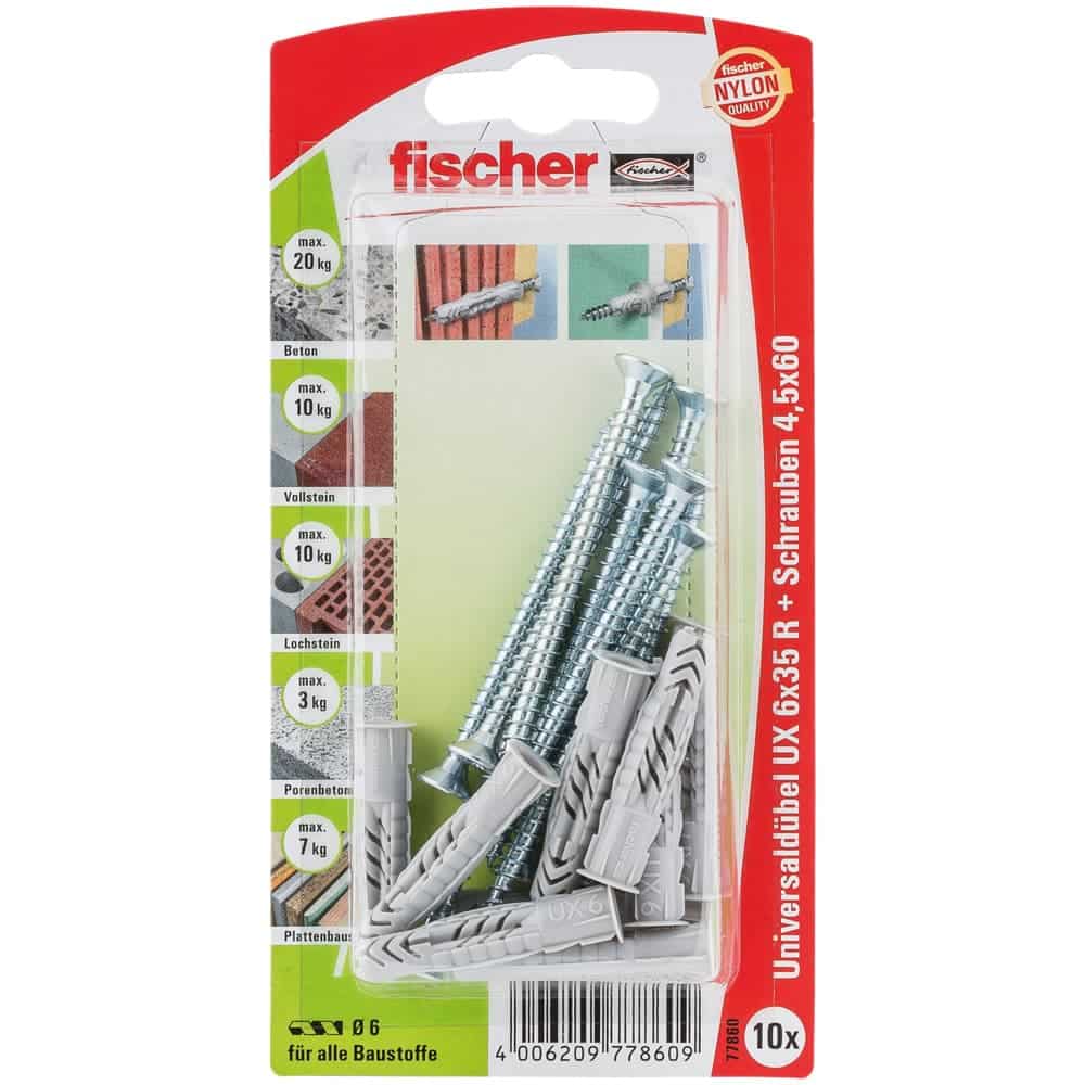Der fischer Universaldübel UX ist ein Kunststoffdübel aus hochwertigem Nylon. Der fischer Universaldübel verspreizt in Vollbaustoffen und verknotet in Hohl- und Plattenbaustoffen für maximalen Halt. Damit ist der fischer UX immer die richtige Wahl – auch bei einem unbekannten Baustoff. Der Rand verhindert ein Tieferrutschen bei der Montage. In der Version mit Rand ist der fischer Universaldübel UX für die Vorsteckmontage geeignet. Die mitgelieferten Schrauben sorgen für optimalen Halt.