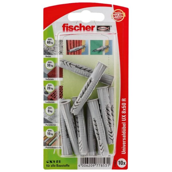 Der fischer Universaldübel UX ist ein Kunststoffdübel aus hochwertigem Nylon. Der fischer Universaldübel verspreizt in Vollbaustoffen und verknotet in Hohl- und Plattenbaustoffen für maximalen Halt. Damit ist der fischer UX immer die richtige Wahl – auch bei einem unbekannten Baustoff. Der Rand verhindert ein Tieferrutschen bei der Montage.