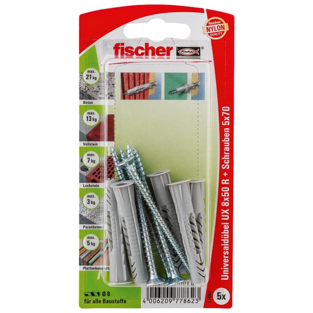 Der fischer Universaldübel UX ist ein Kunststoffdübel aus hochwertigem Nylon. Der fischer Universaldübel verspreizt in Vollbaustoffen und verknotet in Hohl- und Plattenbaustoffen für maximalen Halt. Damit ist der fischer UX immer die richtige Wahl – auch bei einem unbekannten Baustoff. Der Rand verhindert ein Tieferrutschen bei der Montage. In der Version mit Rand ist der fischer Universaldübel UX für die Vorsteckmontage geeignet. Die mitgelieferten Schrauben sorgen für optimalen Halt.
